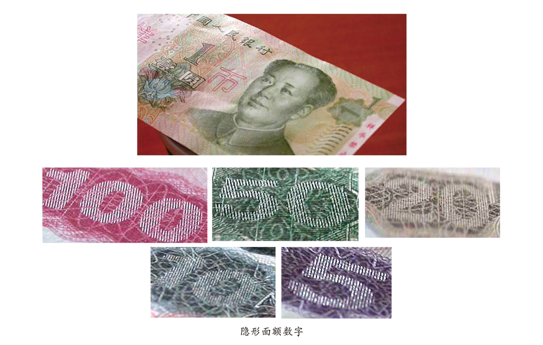 这种特征是利用排列方向不同的凹印线条会产生不同的折射效应这一原理,在钞纸的同一部位构成两种图文。因为在正常情况下看不到其中一些图文,必须把票面旋转到一定角度时才能看到,所以把这种图文称为隐形图文。这种特征使用数字复制设备(复印机、扫描仪、打印机)无法复制,容易观察,是一种比较理想的公众防伪特征。